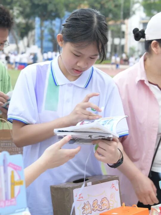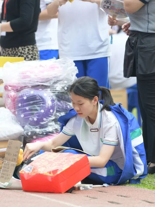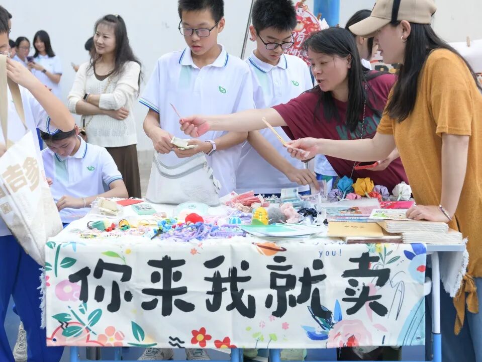 当天下午的义卖现场,更是一幅生动的爱心画卷!田径场、篮球场上,一个个创意摊位整齐排列,“微光集善”“治愈事务所”等别致的摊位名称映入眼帘,彩色条幅、创意海报、暖心手举牌将摊位装点得温馨亮眼,班级文化与爱心主旨完美融合。学生手作专区的书画、文创、手工制品精巧别致,闲置书籍、文具等实用物品分类摆放、明码标价,每一件好物都承载着师生们的浓浓爱心。