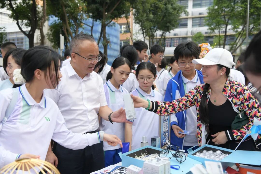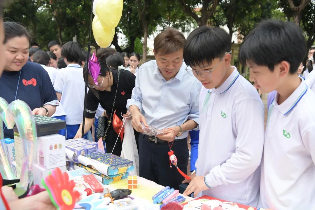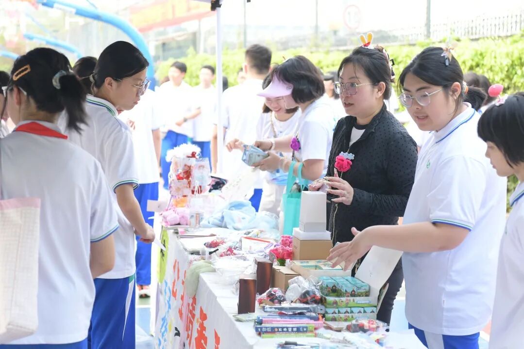 摊位前,小小售货员、推销员们身着整齐校服,少先队员系着红领巾,团员佩戴团徽,礼貌热情地招揽顾客,“老师老师,来看一看我们的手作吧”“这份小摆件是同学亲手做的,献爱心的同时还能收获小美好”……真诚的叫卖声、介绍声此起彼伏。校长老师们也化身爱心顾客,穿梭在各个摊位之间,挑选心仪物品,为公益助力;九年级的同学们虽未设摊,却也积极参与,用选购物品的方式传递善意;家长志愿者们忙碌在各个岗位,协助售卖、维持秩序,家校同心,让爱心氛围愈发浓厚。社团特色摊位、团委联动摊位、工会爱心摊位同样人气满满。创客社团的激光造物、钩织课堂的手工制品尽显学生创意,工会杂货铺里老师们的爱心捐赠品备受青睐,每一个摊位都成为校园里的爱心打卡点。